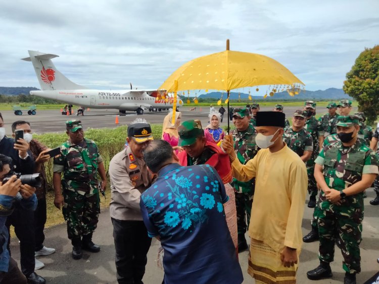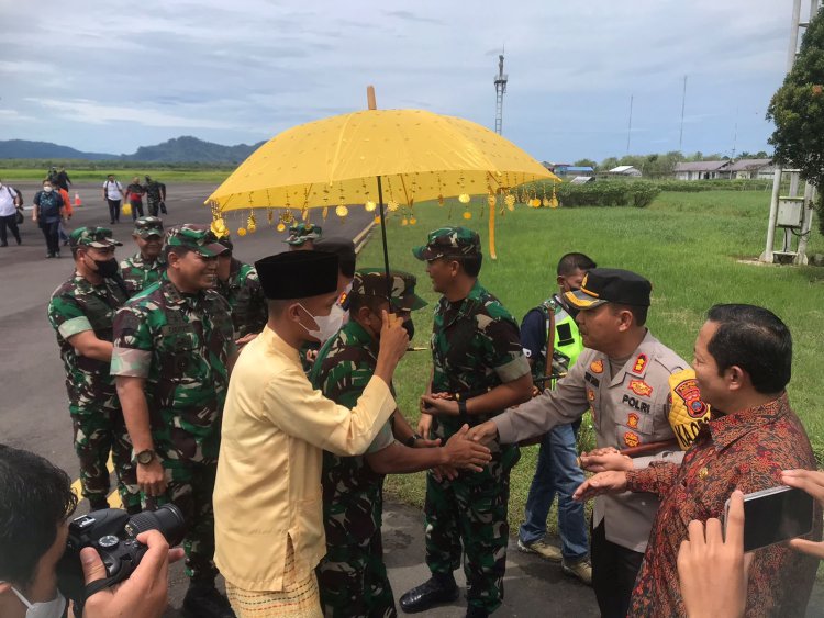 Tapteng, Pijar Tapanuli - Danrem 023/KS Kol Inf Dody Triwinarto, Kapolres Tapanuli Tengah AKBP Jimmy Cristian Samma,S.I.K Bersama Kapolres Sibolga AKBP Taryono Raharja serta Forkopimda Tapanuli tengah dan Sibolga sambut Kasdam I/BB Brigjen TNI Rifky Nawawi,S.E,M.Hum Dibandara Pinang Sori untuk kunjungan kerja di wilayah Korem 023/KS, Kamis (8/11/2022) Pukul 12.00 Wib.