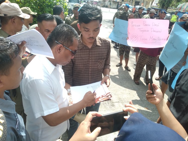 Massa yang melakuka aksi unjuk rasa dipimpin Riski Endah sekaligus orator aksi, tiba didepan kantor bawaslu Sibolga dengan membawa kertas karton yang berisi : "Perkuat Pemilu Damai, tegakkan Demokrasi, Tolak Money Politik", "Bawaslu kuat, Indonesia Hebat, Stop Money Politik, Tindak dan berantas", " Bersama Rakyat awasi Pemilu, Bersama bawaslu tegakkan Pemilu".