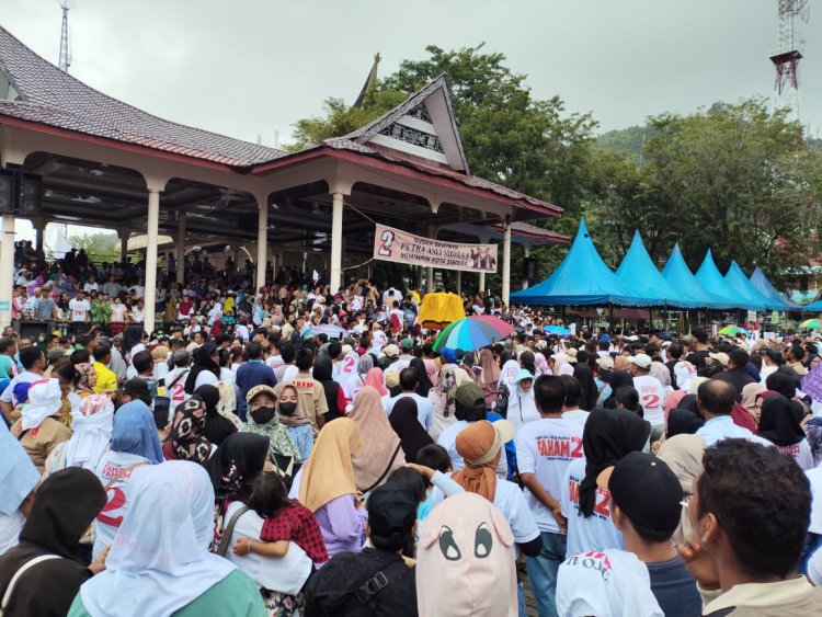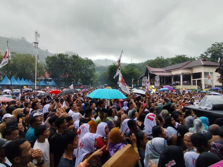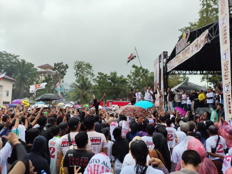 Sibolga, Pijar Tapanuli - Walaupun Diguyur Hujan yang cukup deras, tidak menyurutkan masyarakat kota sibolga pendukung dan simpatisan pasangan calon nomor urut 2 FAHAM yang diperkirakan mencapai 15 ribuan massa, hadir untuk mendengarkan program dan visi misi tim kampanye dalam kampanye akbar Paslon Faham, kamis (12/11/2024) di lapangan simare mare sibolga.